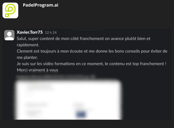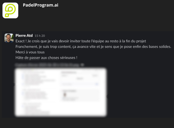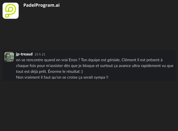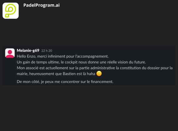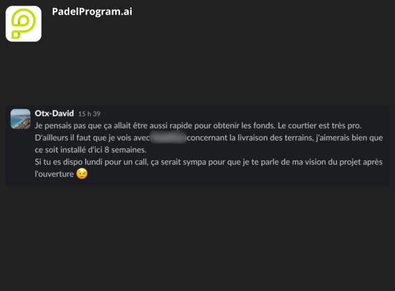 EXCELLENT Basée sur 8 avis Publié sur Yohan MarcelTrustindex vérifie que la source originale de l'avis est Google. L’équipe de PadelProgram.ai a vraiment clarifié les étapes et priorités de mon projet. Je sais exactement où aller, quoi faire, dans quel ordre, et ça enlève énormément d’incertitude. Je recommande.Publié sur Val GrisoniTrustindex vérifie que la source originale de l'avis est Google. Très grande assistance sur le foncier, l’expert a su me trouver un terrain alors que j’étais bloqué sur cette partie depuis plusieurs mois. Je recommande l’accompagnement à 100%.Publié sur Diego PAEZTrustindex vérifie que la source originale de l'avis est Google. Merci à toute l’équipe de PadelProgram pour son accompagnement et sa disponibilité.Publié sur julien magnacTrustindex vérifie que la source originale de l'avis est Google. Un grand merci à l’équipe pour l’accompagnement ! Cela faisait 4 mois que j’étais bloqué sur le foncier … à chercher un hangar sans pouvoir avancer. Au bout de six semaines de recherche avec l’expert, on a enfin trouvé le local. Hâte de recevoir les terrains maintenant. Je ne peux que recommander PadelProgram pour leur professionnalisme.Publié sur Kylian MarchessonTrustindex vérifie que la source originale de l'avis est Google. Je remercie Clement et son équipe pour l’accompagnement. N’ayant pas beaucoup de temps libre, cette solution me permet d’avancer dans le projet en toute sérénité. Je recommande.
